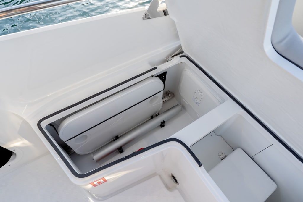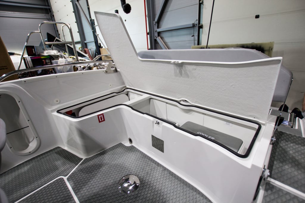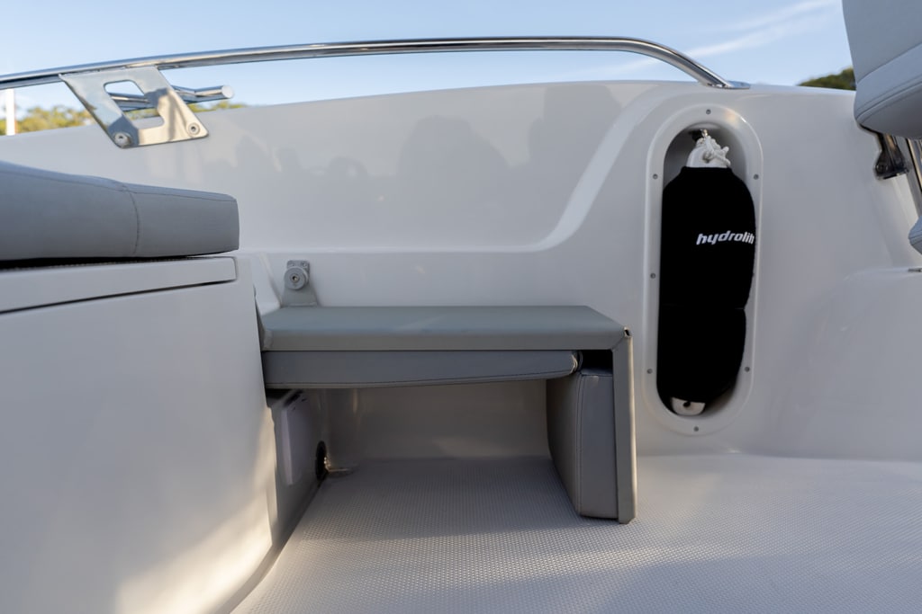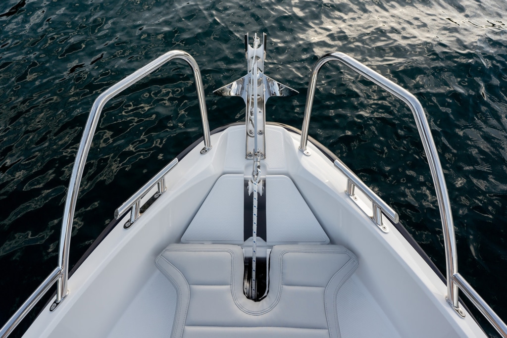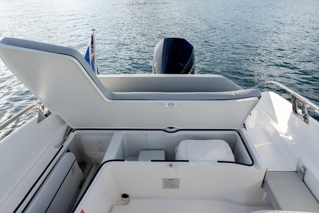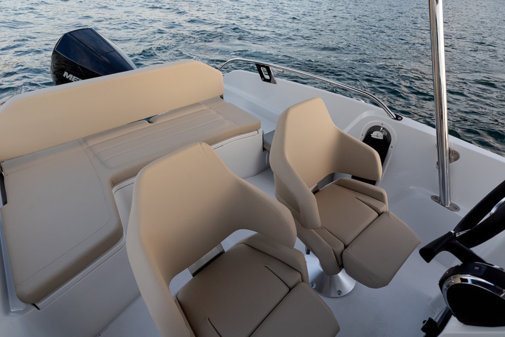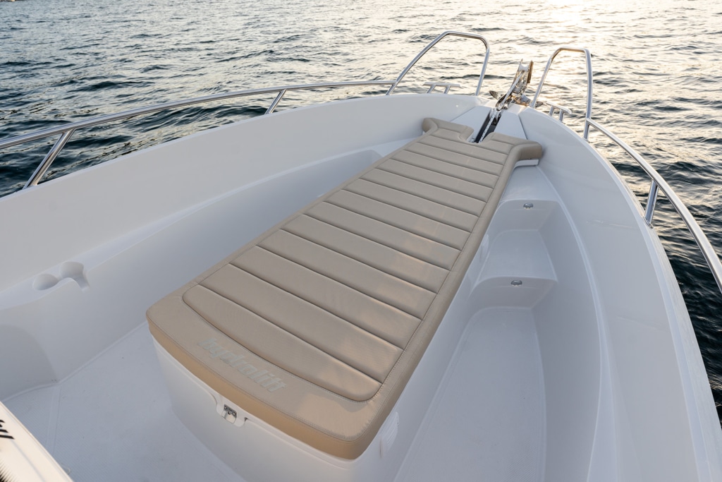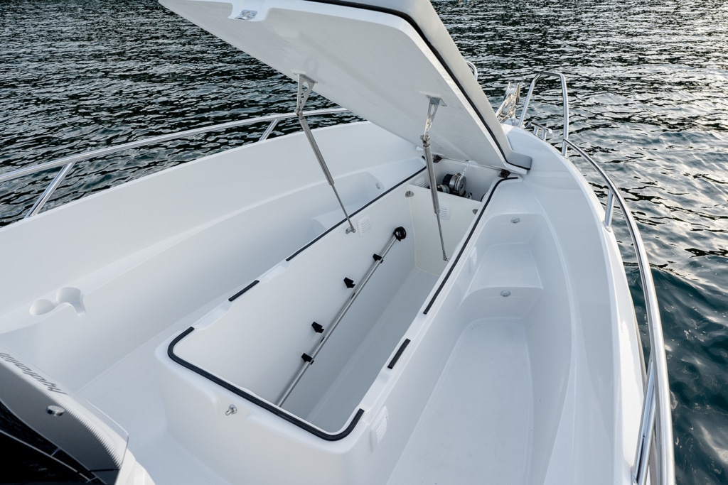 In the bow section, the spacious and comfortable bench seating doubles as storage room, or can be configured as a sun lounge for those wanting to spend more time in the sun. The stylish pilot console houses a large navigation panel that lays the foundation for a comfortable and safe trip on the water.